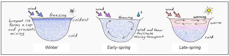 During winter, deeper waters can become depleted of oxygen, especially in lakes with thick ice cover and lots of organic matter. Spring turnover resets the system. Oxygen reaches the depths again, and nutrients that have settled at the bottom are brought back up toward the sunlight—fuel for new growth.